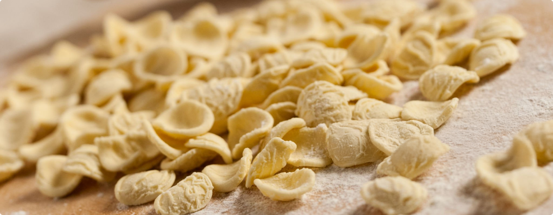 Le orecchiette sono un formato di pasta fresca a base di semola rimacinata di grano duro, simbolo gastronomico della regione Puglia. Rigorosamente lavorate a mano, le orecchiette hanno la tipica forma tonda e concava, con la superficie rugosa e l’interno più sottile del bordo.